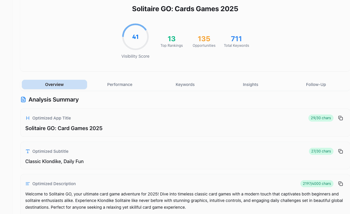 AI evaluates competitors, selects high-impact keywords, and refreshes your metadata faster than any manual workflow ever could.