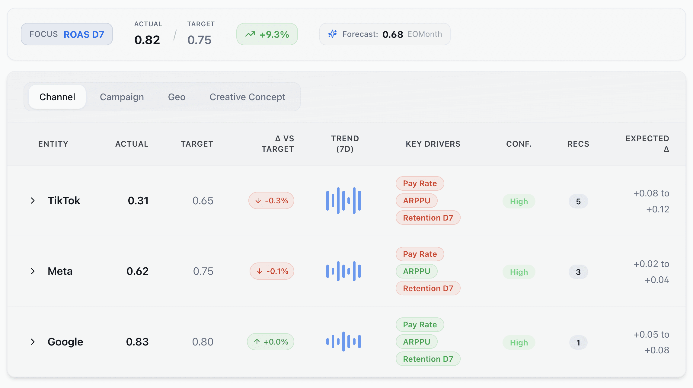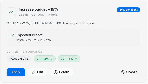 No more manual bid changes, budget shifts, or pausing underperformers. The UA Agent continuously executes growth decisions across Meta, Google, TikTok, Applovin and more — optimizing toward your ROAS, CPI, CPA and volume goals with zero intervention.
